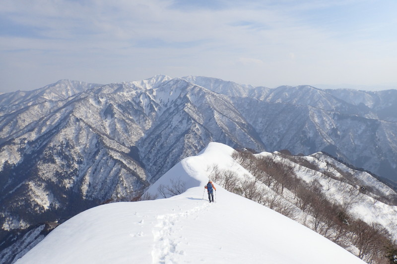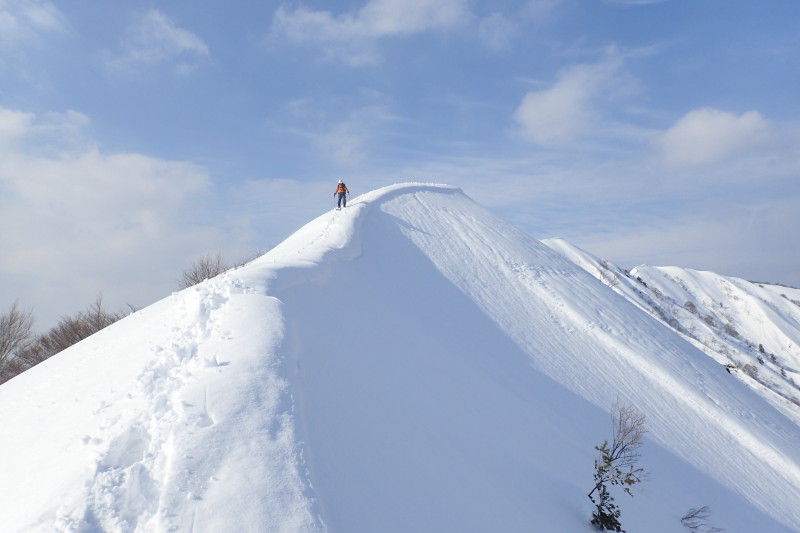 左右は切れ落ち、ほど良い緊張感を楽しみながら狭いピークに立った。振り返ると細い雪稜に刻まれたトレース