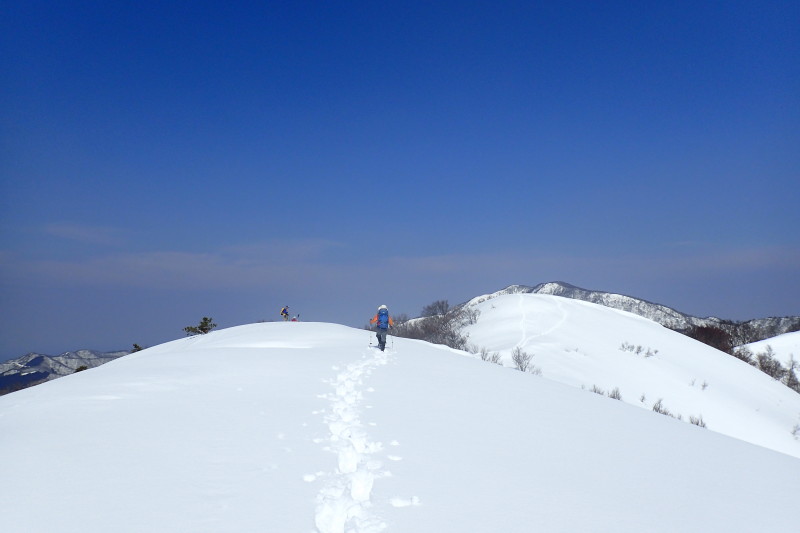 意外なことにトレースが現れ、二つの人影が見えた。山頂で言葉を交わすと、北西側の大内峠から登ってきた
