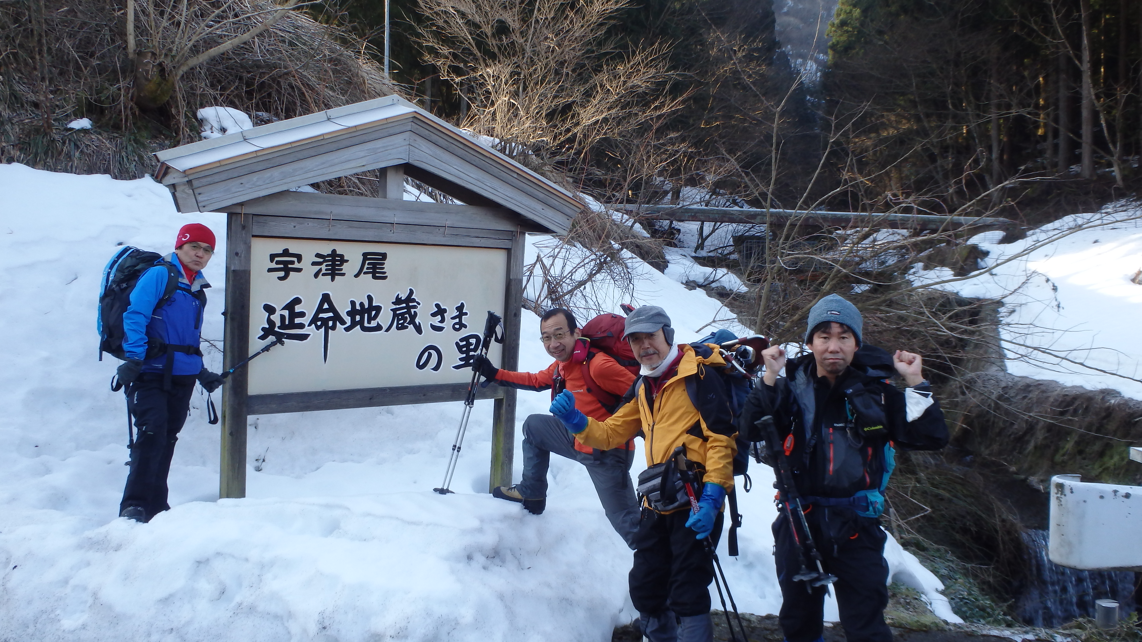 日の出直後に1m以上の雪に覆われた宇津尾の集落を出発します。 「船ヶ洞山」から「下谷山」へと向かう尾根の末端は「延命地蔵大菩薩」のお寺となっており、雪に埋もれた階段からスノーショーを履いていきます。 ここで先行者の方2名を見かけ、密かにらくできると思いましたが、実際にはすぐに追い抜き、後ろからプレッシャーを掛けながらの登りとなってしまいます…。