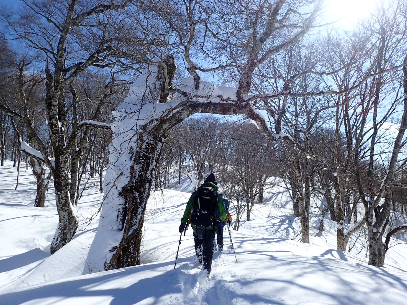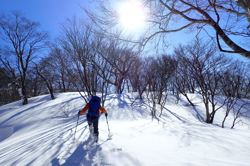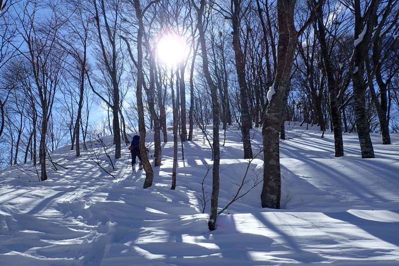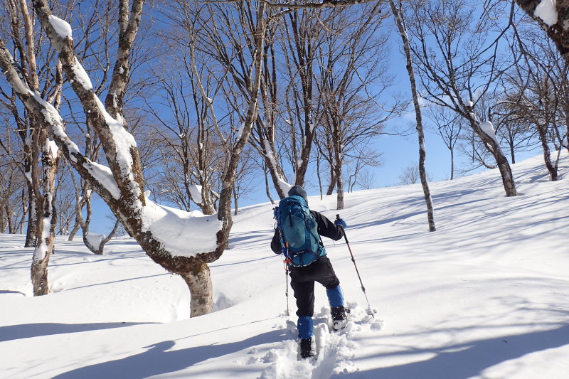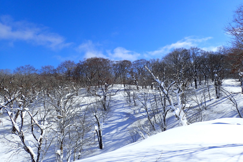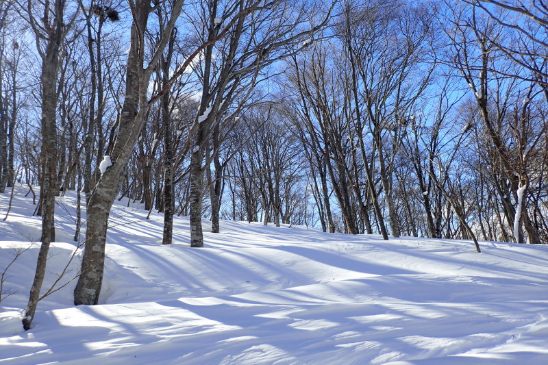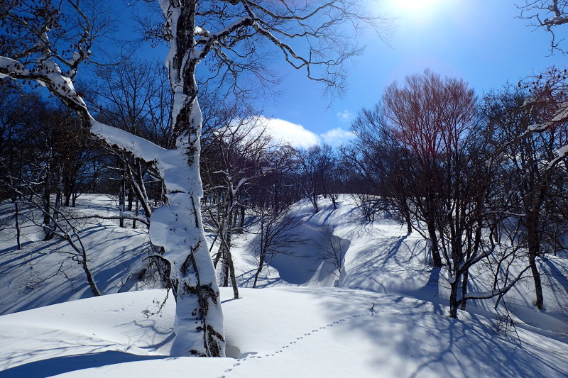 微妙なうねりを見せる雪面にブナやミズナラ、トチの巨木が影を落とす。季節限定の芸術作品のような地形に