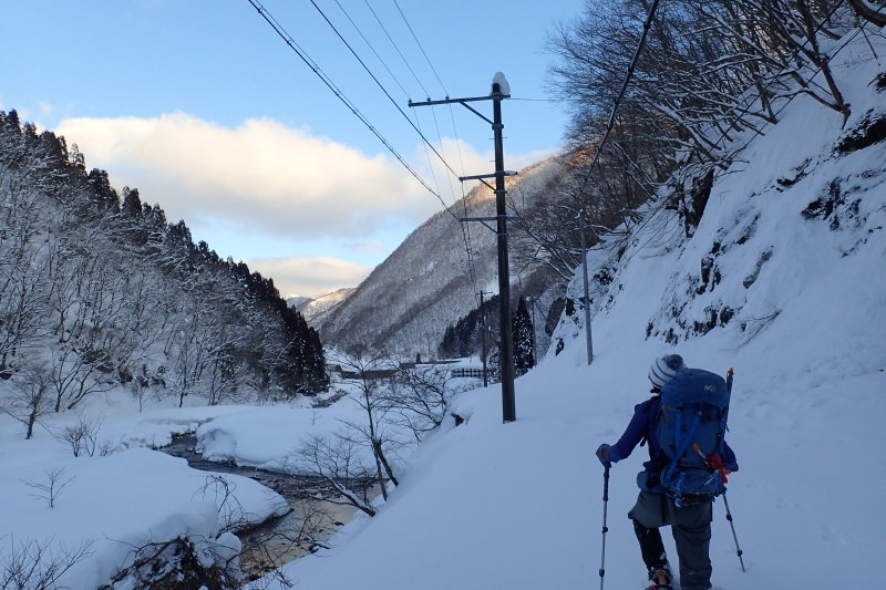 た雪は、林道からそのまま川へと続いている。幸いにも積もったばかりの雪は柔らかく、用意してきたピッケル
