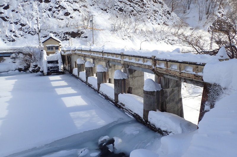 横を流れる坂内川は、水の流れているところだけが黒く、広い河原は真っ白な雪原となっている。