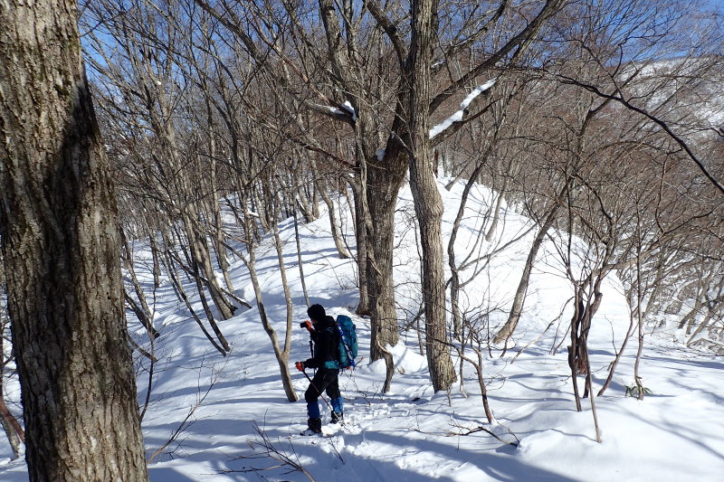 谷幅が狭くなり、地形図にガケ記号の書かれたところが唯一の難所だ。40度以上はあるだろう急斜面に積もっ