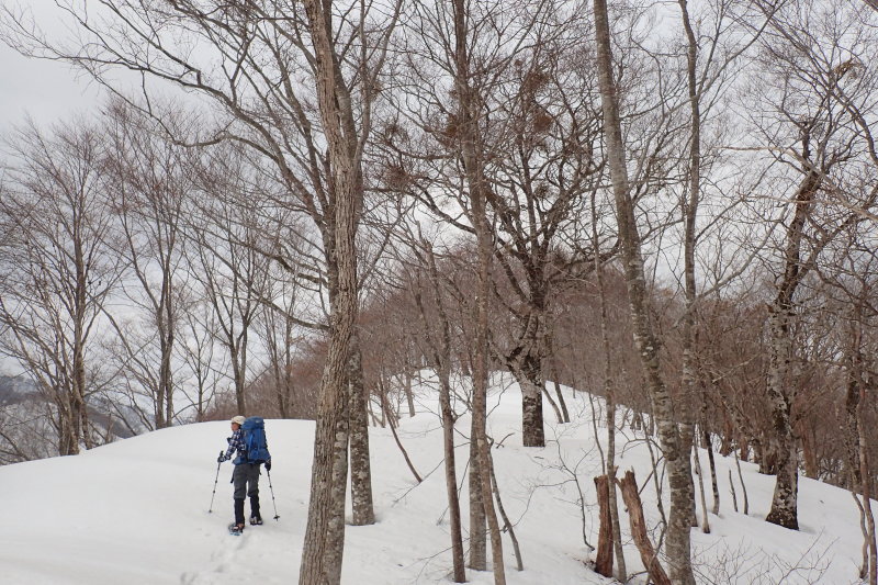 雪の段差を滑り下りたり、根上がりのヒノキの下を通ったり(腰を屈めず通れました)ヤドリギだらけのブナの木を見上げたり、