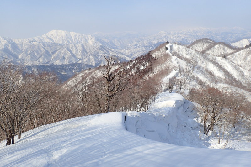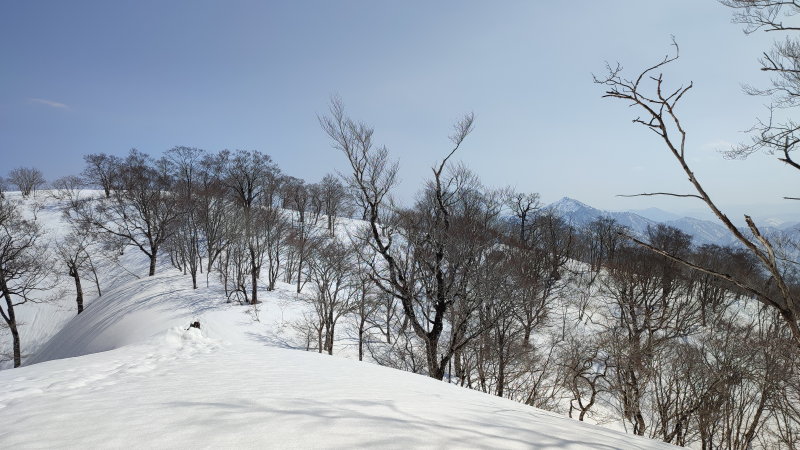 この雪庇を伴った北峰の山頂と、南峰へ続くたおやかな尾根、そこへ食い込むワサ谷の源頭とブナ林、広々とした南峰の山頂と、