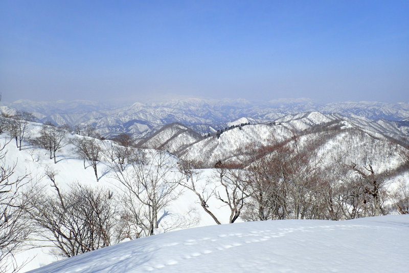 左右とも全開の展望を楽しみながらのビクトリーロードを進む。北に目を遣れば純白の荒島岳が縫ヶ原山を従えて