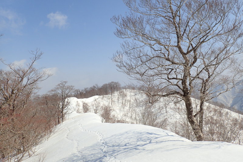 北峰と南峰を結ぶ広い尾根とワサ谷源頭が作り出す、雪に覆われた地形のうねりが美しく、思わず見惚れてしまっ