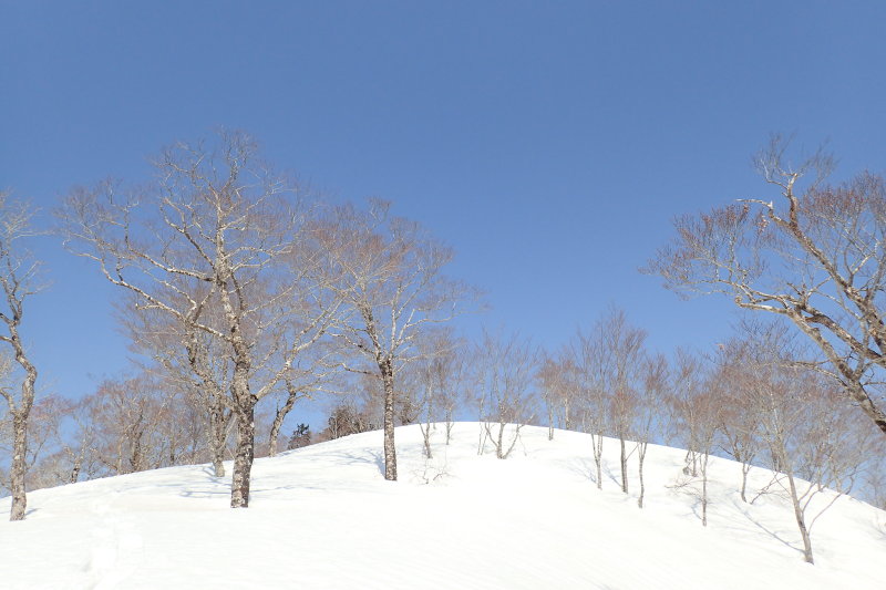 やがて植林が切れ、クロカンスキー場からの尾根を合わせる頃には少しずつ日が差し始めた。雪面に映る木の影