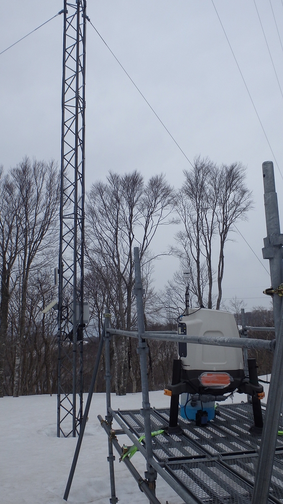 20分足らずで観測鉄塔。ここから左(南)の尾根を下る。雪面にトレースはないが、黄砂のせいか薄汚れているのが残念。なだらかなブナの回廊を快調に下る。ただ不安なのは、大音波谷左俣へ落ちる斜面の様子だ。事前のネット情報も見当たらなかった。
