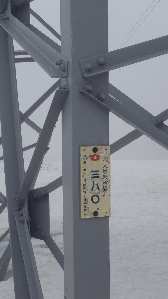 送電鉄塔には「大黒部幹線三八〇」昭和38年10月――とある。この年は黒部ダムが完成した年だ。なんと60年近くになる。「大黒部幹線」は全長245km、黒部から小浜を経て関西各地へ電力を送っている。(wiki)