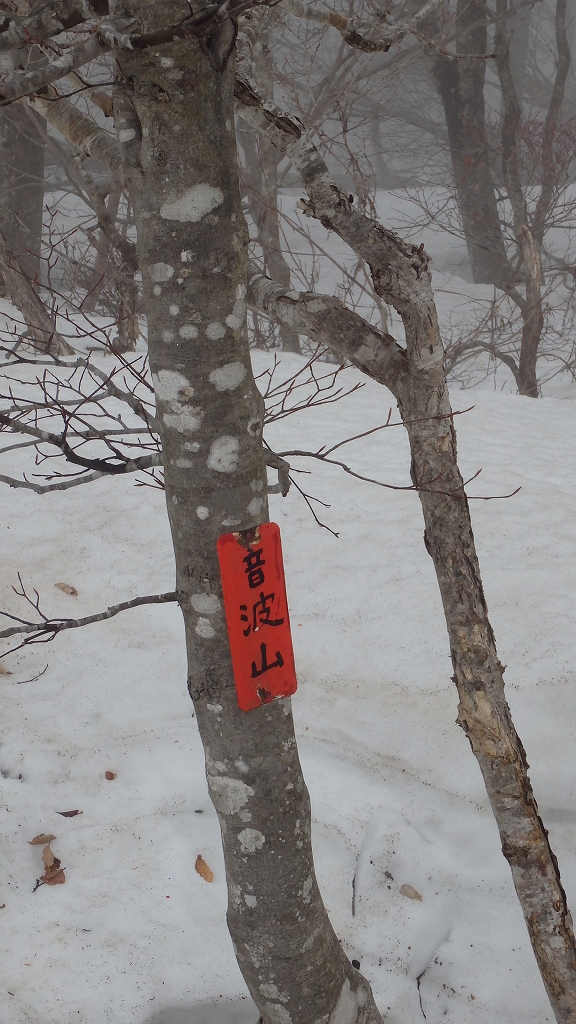30分かけて音波山に10時半。赤い標示板がなければスルーしそうな山頂だ。まだガスは晴れない。この先も稜線から張り出した支尾根が見え隠れするくらい。南の大音波谷側は見通せるのだが上部はガスの中。