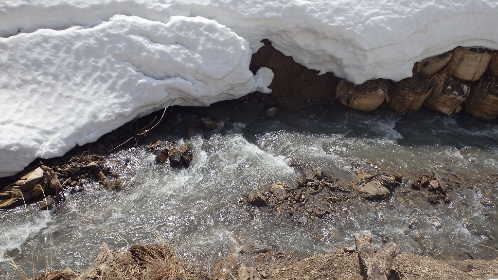 ここからがまた大変だ。谷は雪解け水が大ハシャギしている。川幅は2m足らずだが跳んで渡れるほどの跳躍力はない。さらに対岸には1m以上の雪壁が! わりばしさんはイブネの帰りに靴を脱いで素足で神崎川を渡ったというが、そんな丁寧な作法は持ち合わせない。少し上流へ移動すると、雪庇が割れて雪壁が低くなっている箇所を発見。ここしか無いやろ…。行っちゃえ!