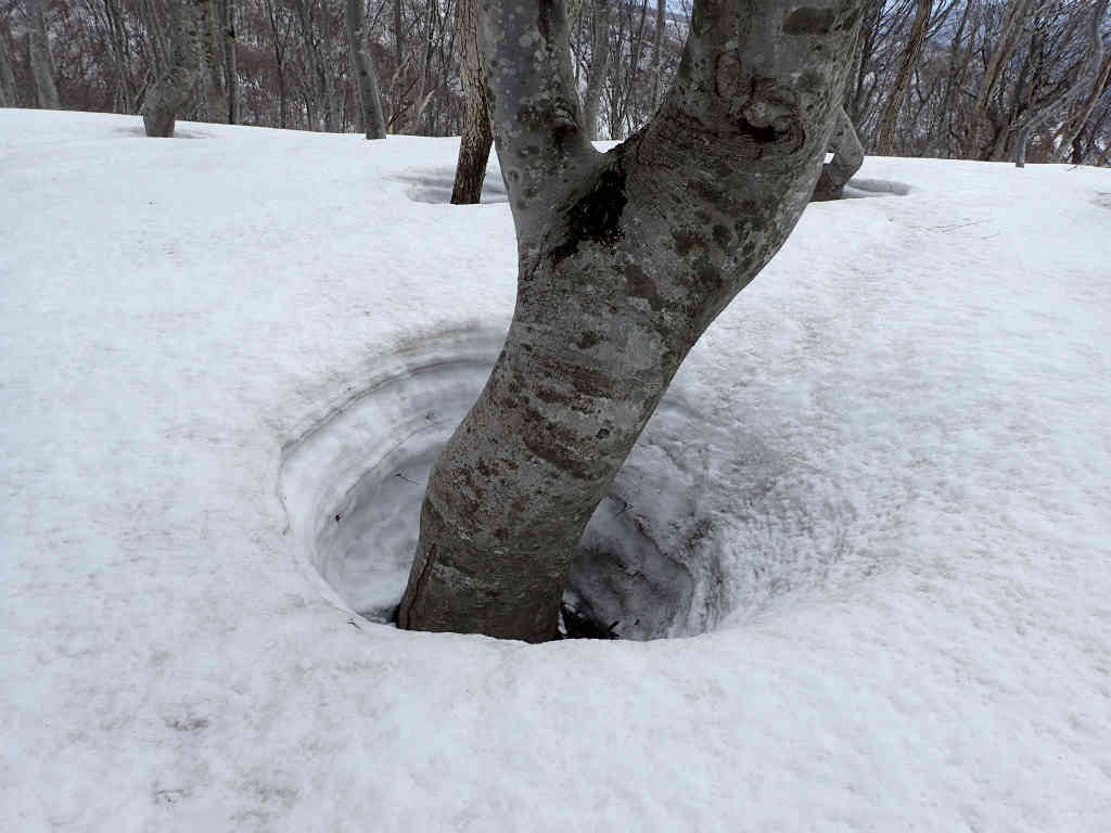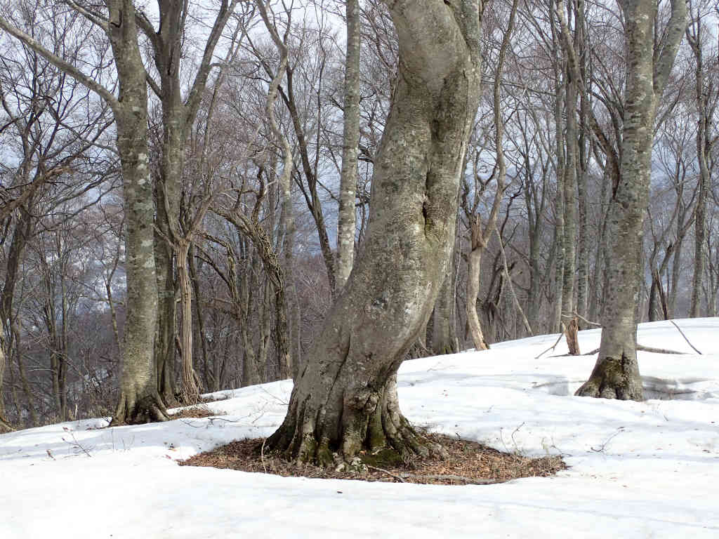 大黒山の頂上は広々としていて,雪はまだ2m近くありそうだ。美しいブナ林である。山日和さんがこの辺りのブナ林を好む理由がわかるような気がする。