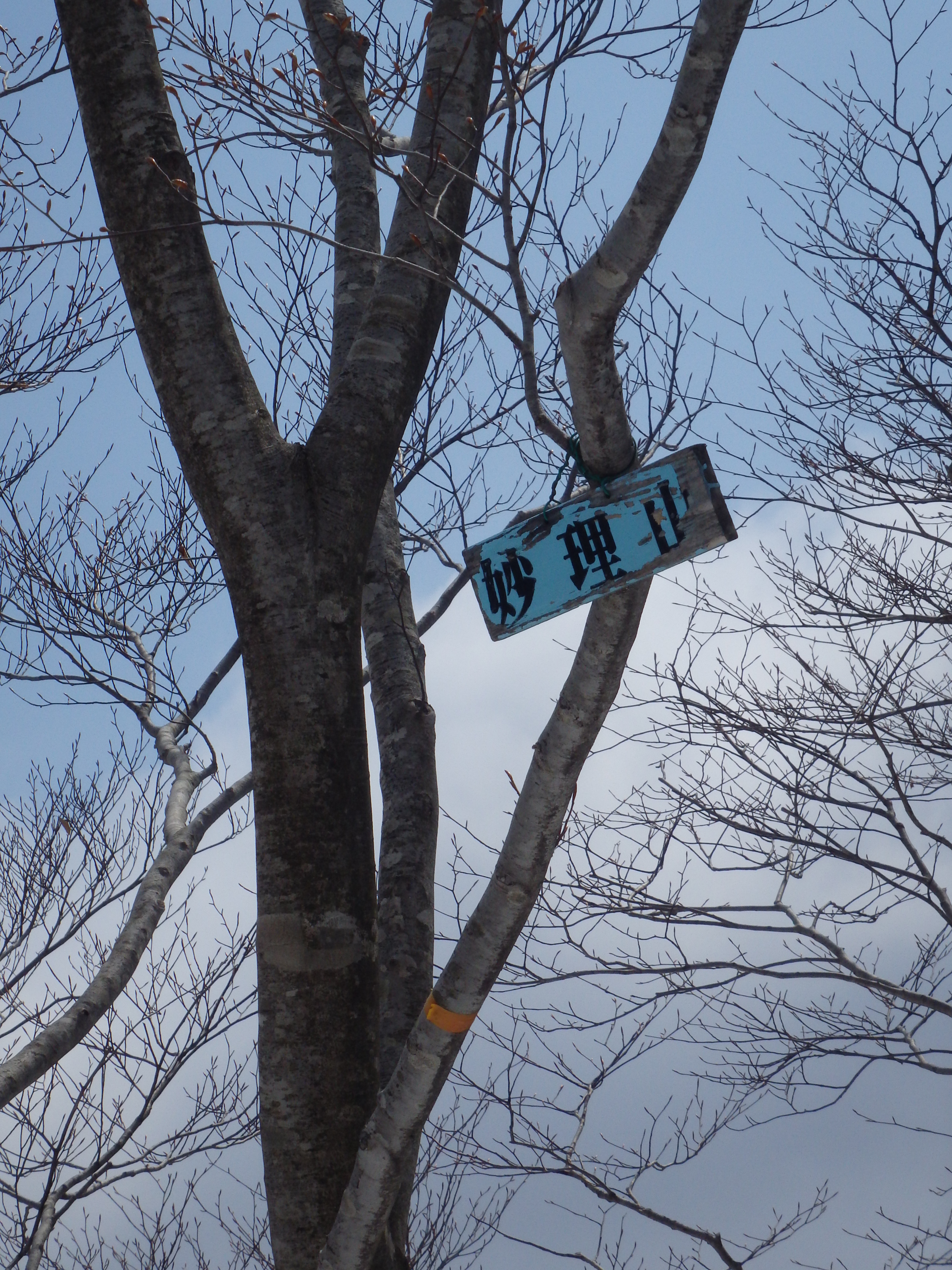 妙理山頂の木にこんなプレートありました?足元に幾つかプレートがありました。 大黒山でもプレートを探したんですが,見当たらず。まだ積雪が2m近くあるんで,雪の下かも。[/color]