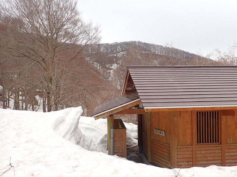 年度末は平日に登れるので、少し遅いかと思いつつ湖西の山に登ることにした。マキノスキー場をすぎ白谷から黒河林道に入る。すぐに雪が道をおおい進めなくなったこので、ここに駐車した。林道は雪が解けて地面が見えている所もあるが、積もった雪が片斜面になっている所も多く通常なら緊張する場面だ。今週の雨で片斜面のコンクリート部分が顔を出し、歩けるので助かった。自然林の山の林道歩きは明るく気持ちがいい。高度を上げて進んでいくと黒河越のトイレが雪に沈んでいた。