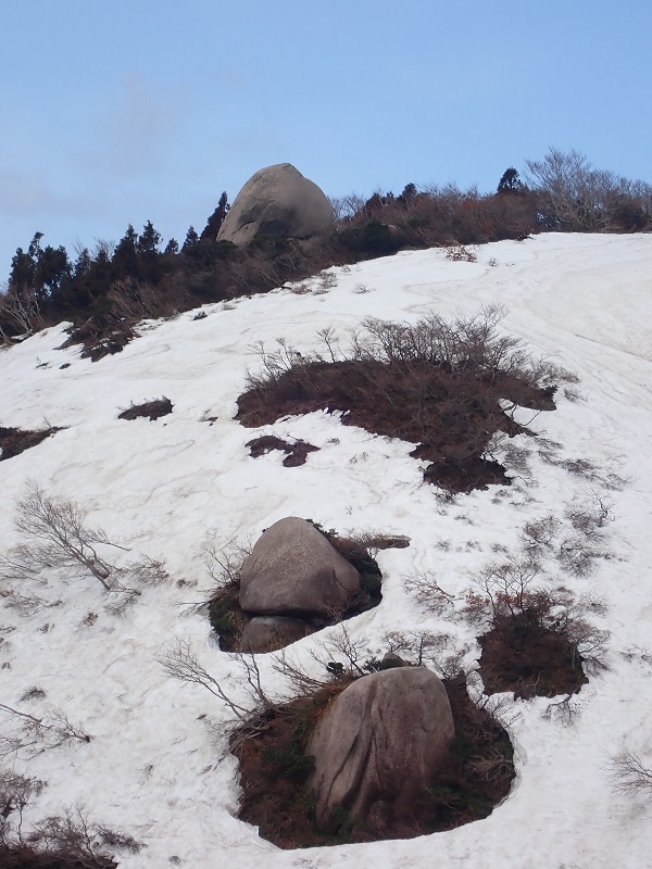 ここまで、雪はつながっていたが、まだらな感じになってきた。登山道を中心に地面が見えている。この辺りも雪のシーズンはかなり降ったとの記憶ですが、