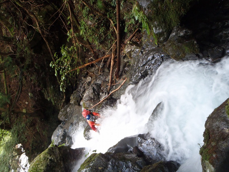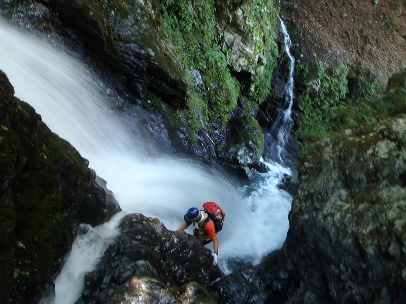 10mの滝、左の外傾気味のバンドを斜上、水線際を直上した。沢二回目の青年も続いたが、足を滑らせズルッと落ちた。