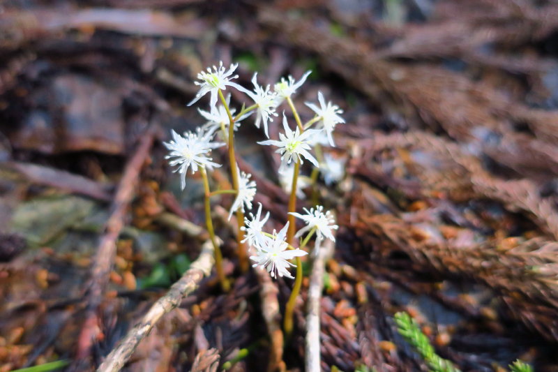 杉林の中に、ちいさな白い花がたくさん咲いていた。オウレンだった。