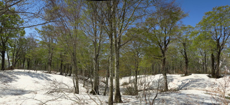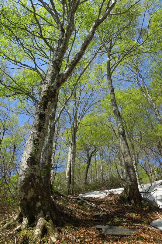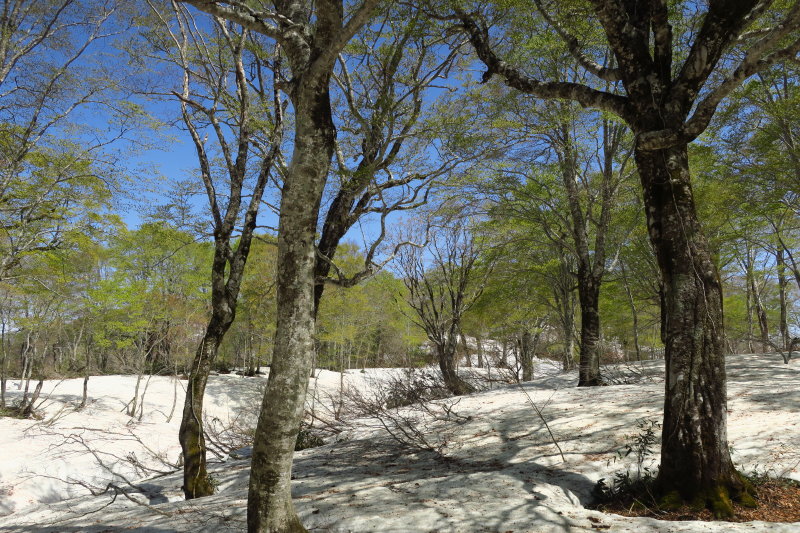 新緑のブナが立ち並ぶ雪残る伸びやかな台地の情景に、一期一会の輝きを感じました。