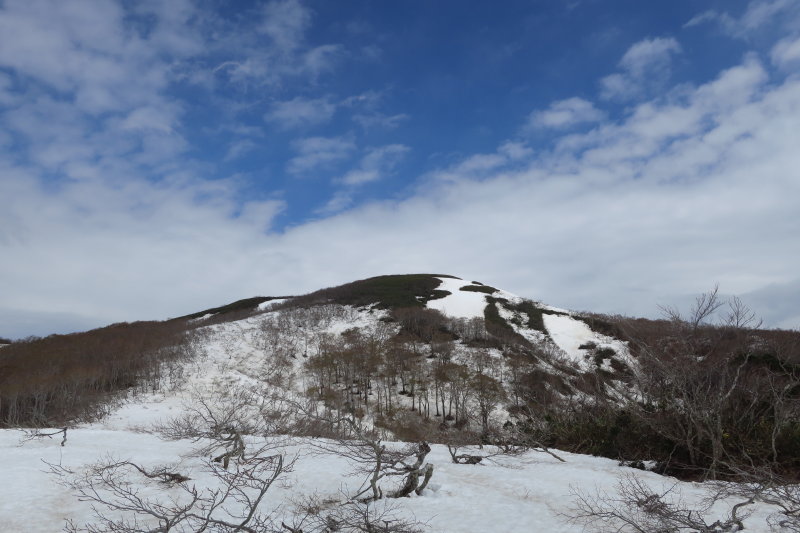 下りでは迷いそうな、新緑とまだら雪で飾られたうねりの中を△1205.2奥の塚を目指し登っていく。