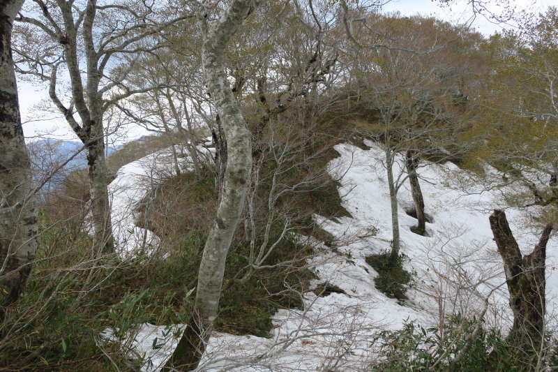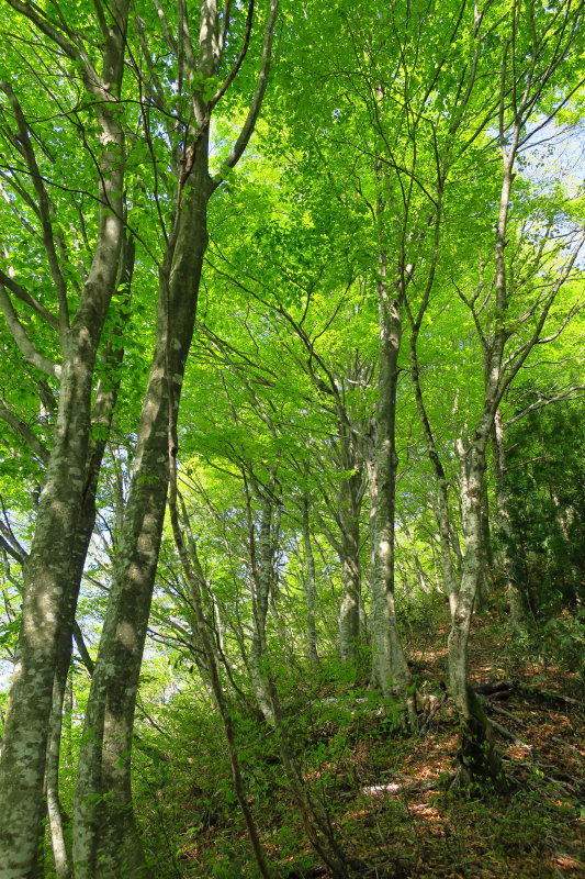 峠からは、ブナの間を通り抜ける爽やかな5月の風にのって、口笛を吹きながら歩きたくなるような、