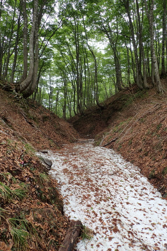 もう5月も半ば、標高600mほどしかないというのに、谷間には大きな雪のブロックが残っていた。