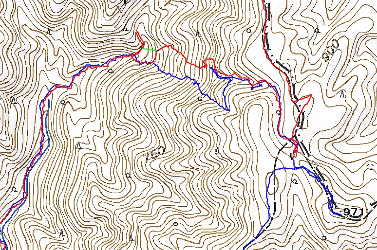 青が昨年、赤が今回の軌跡。緑は想定していたライン。まさか等高線沿いに谷が流れているとは・・・
