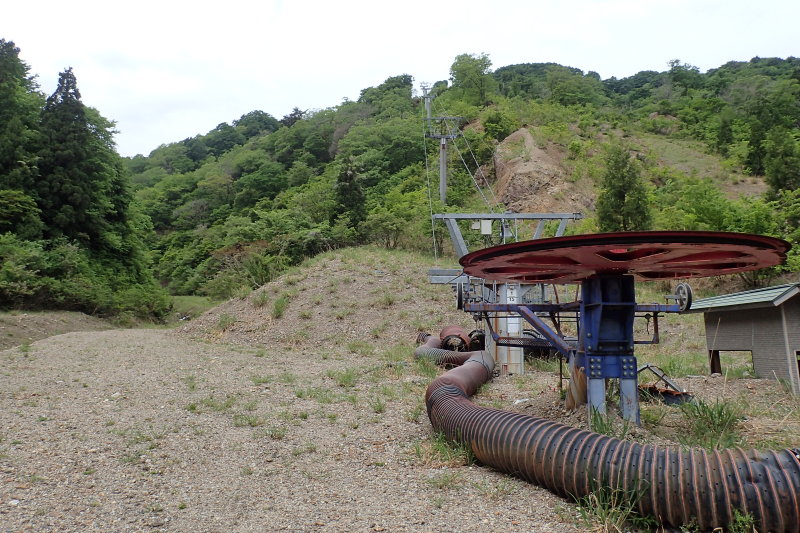 の外されたリフトが続いている。谷には導水管が設置されていたが、流れが変わったのか水流は別のところを流れ