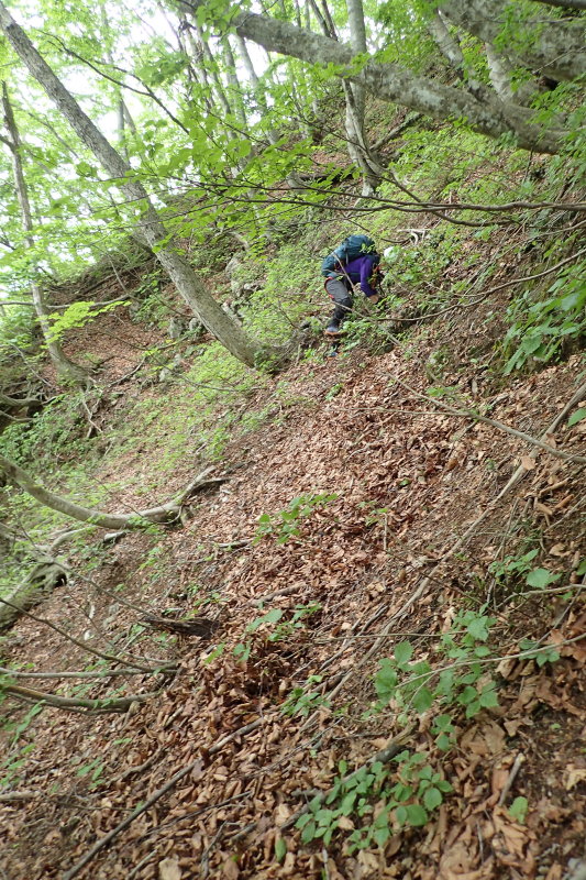 ズルズルの斜面を這い上がって小尾根に乗ればひと安心だが、見下ろす谷はV字の急斜面が続いて、復帰するのが困
