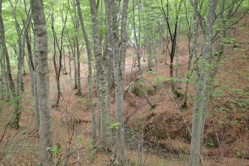 下谷山の山頂は割愛して、栃ノ木峠への国境稜線を辿る。ブナ林が延々と続く素晴らしい稜線なのだが、登山用