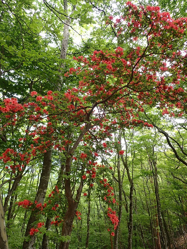 ここで登山道に合流。稜線を歩き水越に近づくとヤブっぽくなってきた。ここが水越谷の源流で、ここまで以前遡行したことがあった。その時は、ガスっており尾根筋を慎重に進んだ。今回は江股ノ頭も見え方向を間違うことはないので、テープに沿ってヤブのなかを進む。ツツジの赤が心を慰めてくれる。ここも滝見尾根が派生するピークは嵓になっており最後は岩の間から稜線に抜けた。