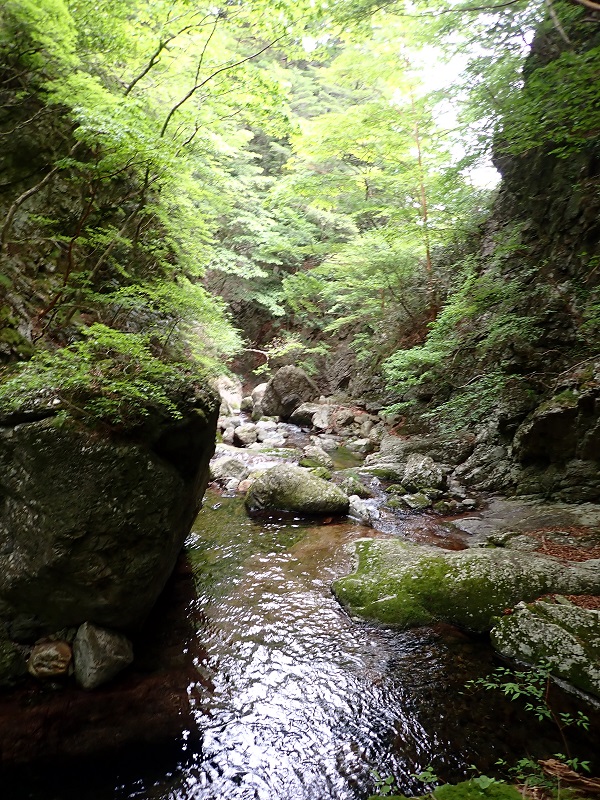 ここから先は異次元エリア(-_-)zzz砥石谷に向かうには、一度風折谷の滝口に降りなければならない。風折滝右岸の巻き道を使うことになる。1カ所いやらしい箇所があり、モンキークライムもしなければならない。