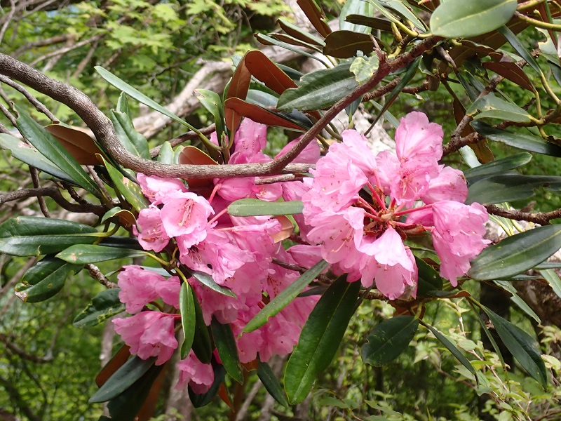 よく見てみると1カ所だけ獣道がつながっている。嵓を巻いている道を進むが、すぐには嵓は切れてくれない。結局反対側まで回り込んで上れる岩尾根になった。尾根が広がりだすと獣道がいくつも走り出す。それにしたって、山桜の木が増えてきた。山桜の木はすごい数で、遠く離れた天井桟敷からも見えるはずだ。ここは下草もなく、さぞかし山桜の時期には華やかな桜の園だろう。ツアーの際に、山桜の名残に見えたのは葉だったようだ。山桜は花とともに葉も出て、葉柄が帯紅色なので、これが見えていたのだろう。