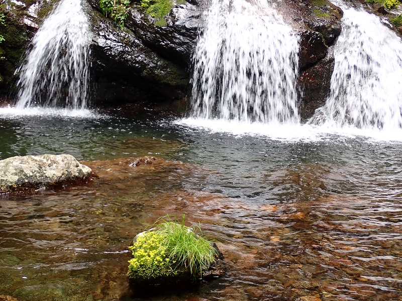 今日は風折滝の水量も多く折れる気配はない。沢筋の岩には密集した緑の茎にヒメレンゲの黄色の花が咲き清涼感を増している。風のある日は滝口から流れ落ちる水滴がミストになって下流に流れてくるが、これもないので風が吹いていないのだろう。