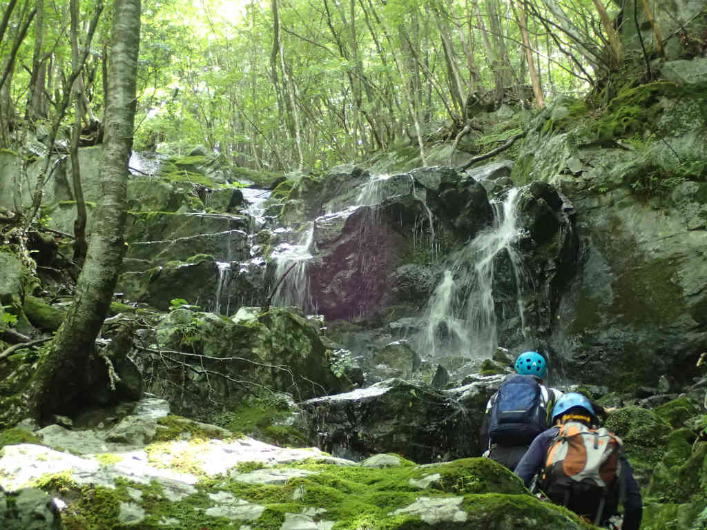 しばらくゴーロを歩くと最初の連瀑帯にでる。10m以内の滝が連なっている。すべてフリーで直登可能なので,こんな楽しいことはない。3人ともボルダリングジムに通っていて,壁を登るのが大好きである。早速,テンションマックスである。これまでは私が先頭を行くことが多かったが,K氏に先に行ってもらい,私は後ろからのんびり行くことにする。