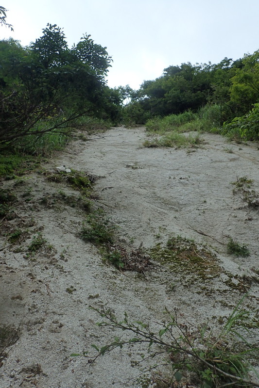 源頭部に入ると花崗岩の砂ザレが目立つ。遠目に見るとフリクションのいいスラブ壁みたいだが、実際には足
