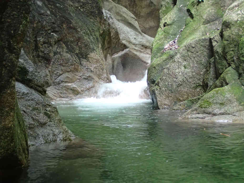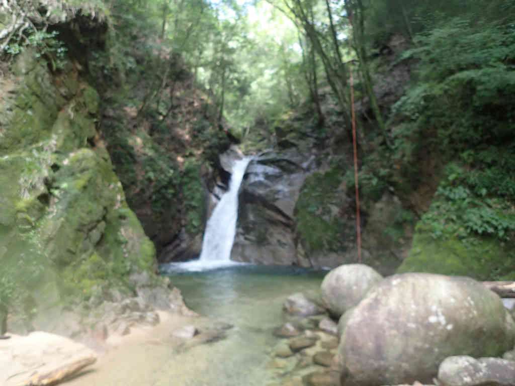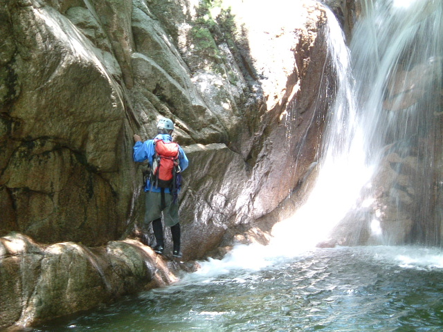 しばらくで大きな釜を持った7m滝。昔はここからダイビングしたものだが,今は心臓麻痺をおこしそうなので飛び込みは封印である。左側の岩場を巻き登る。