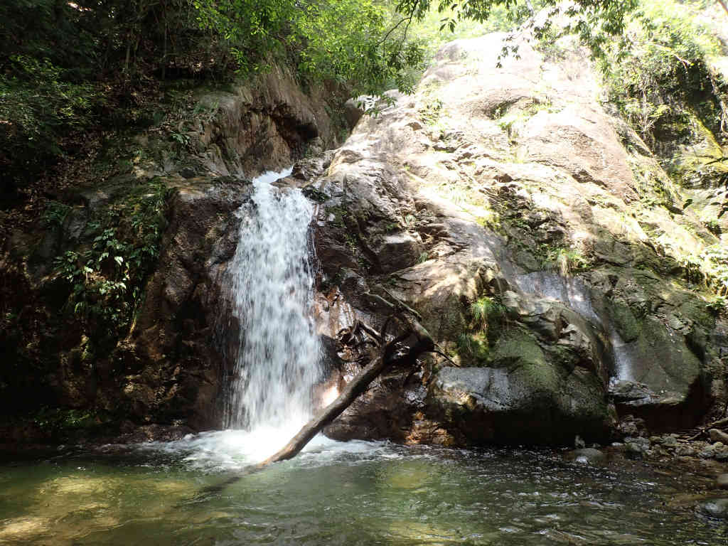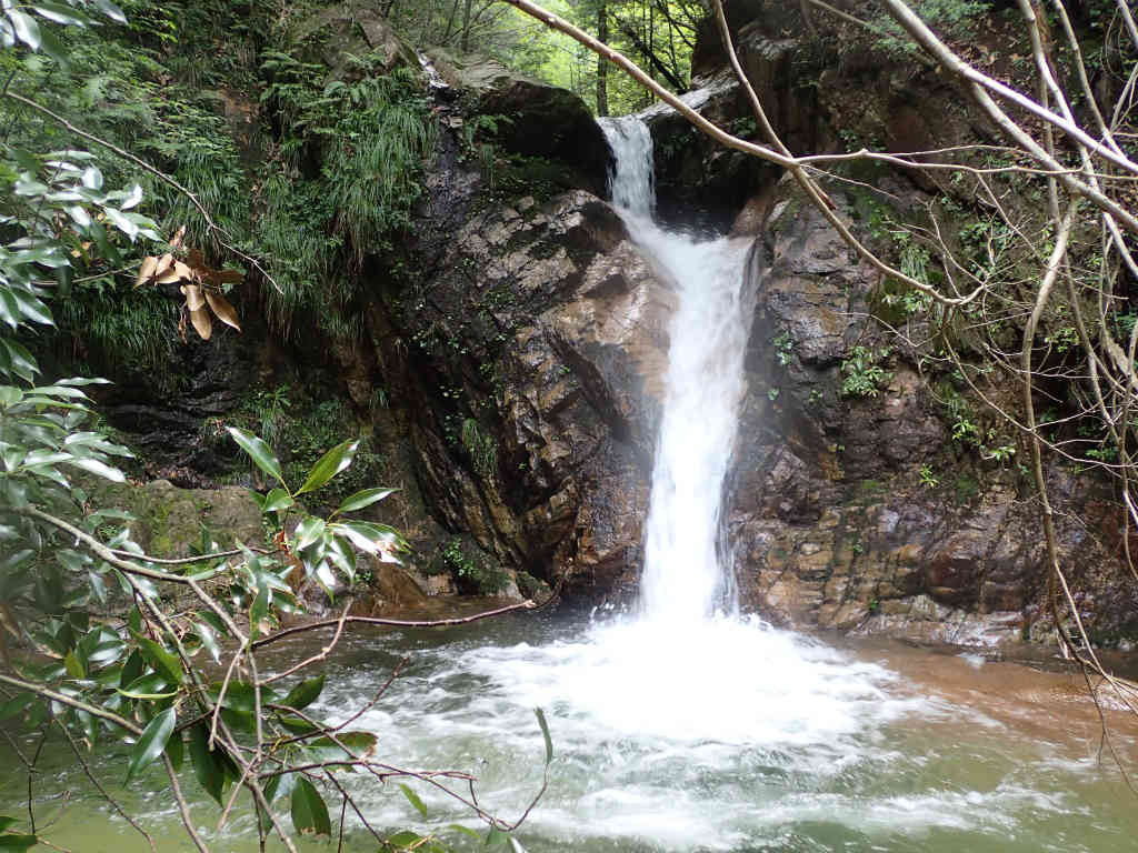 しばらく滝を愛でて下山にかかる。石谷川は登山道がすぐ脇を通っているので下山は楽である。1時間ほどで大堰堤に到着。大堰堤の下に降りるとキャニオニングツアーのガイドたち6人が技術研修をしていた。その脇を通り過ぎ,渡渉して,石水溪バンガロー村に至る登山道に入る。いつもはこのままバンガロー村に降りるのだが,今回は左折して望仙荘に向かう。キャニオニングツアーの人たちが設置した入渓ルートを確認するためだ。苦もなく望仙荘脇に出る。