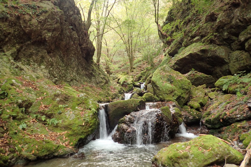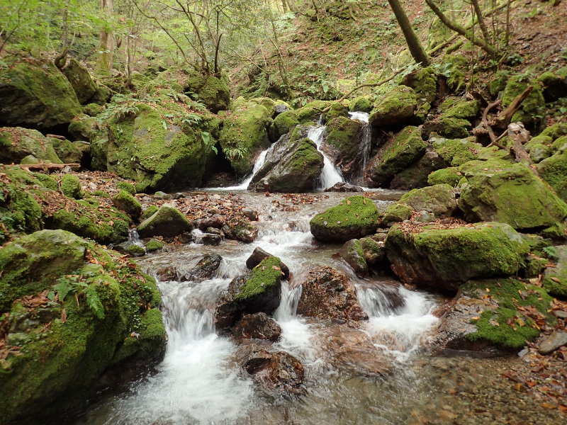 自然林に変わった渓相は美しく、苔むした岩とカツラやサワグルミの森が落ち着いた印象を与えてくれる。沢登