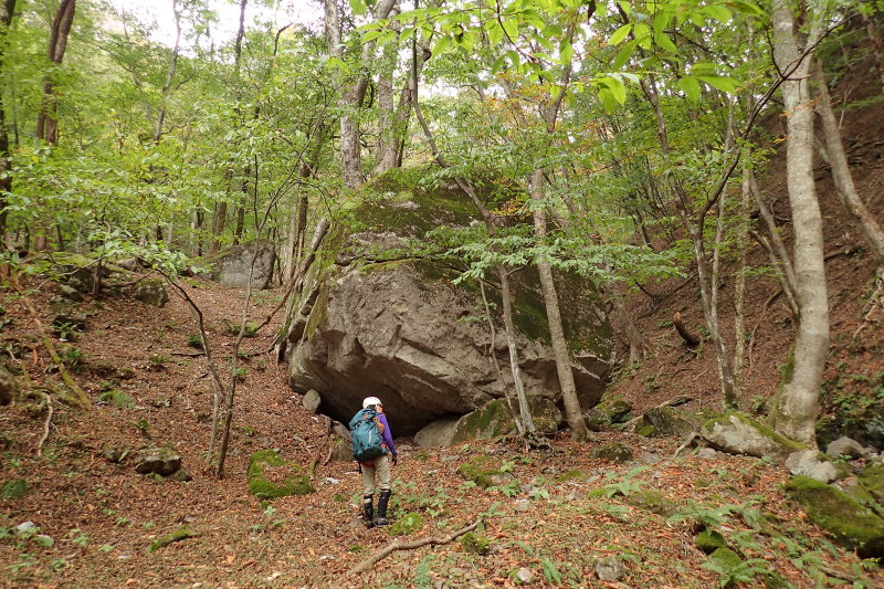 下りのワサ谷右岸尾根は、シロモジの林が續いていきましたね。数週間後の顔がまっ黄色に染まりそうな風景を想像しながら歩いていました。