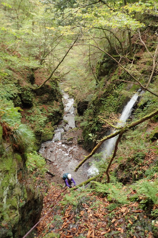 とした15m滝が水を落としていた。右岸の巻きを考えたが、左岸のルンゼに近付いてみると、階段状で十分登れ