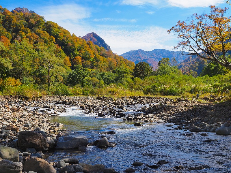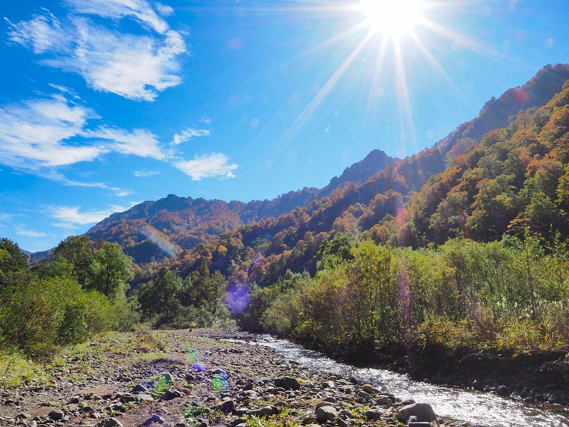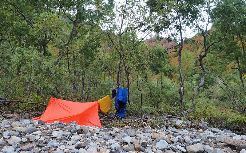 取水口堰堤の上で川に降り立ち、テン場を捜しながら河原を歩く。河畔林自体の紅葉はまだだが、取り囲む山々は絶頂の色づきだ。