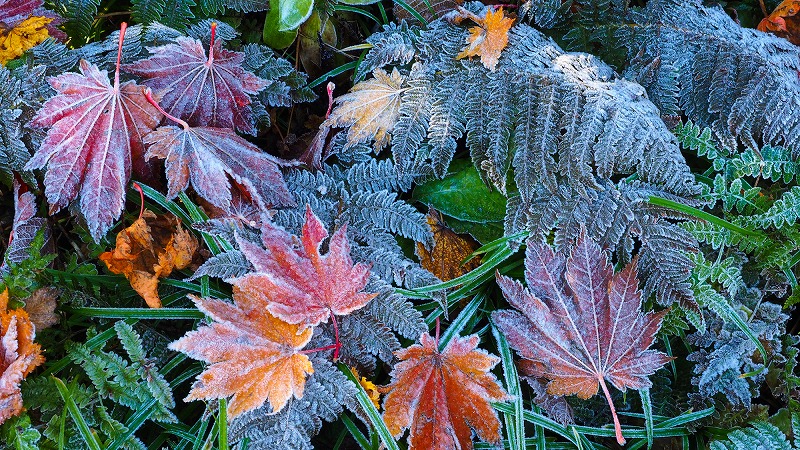 霜のついた落葉が美しい。