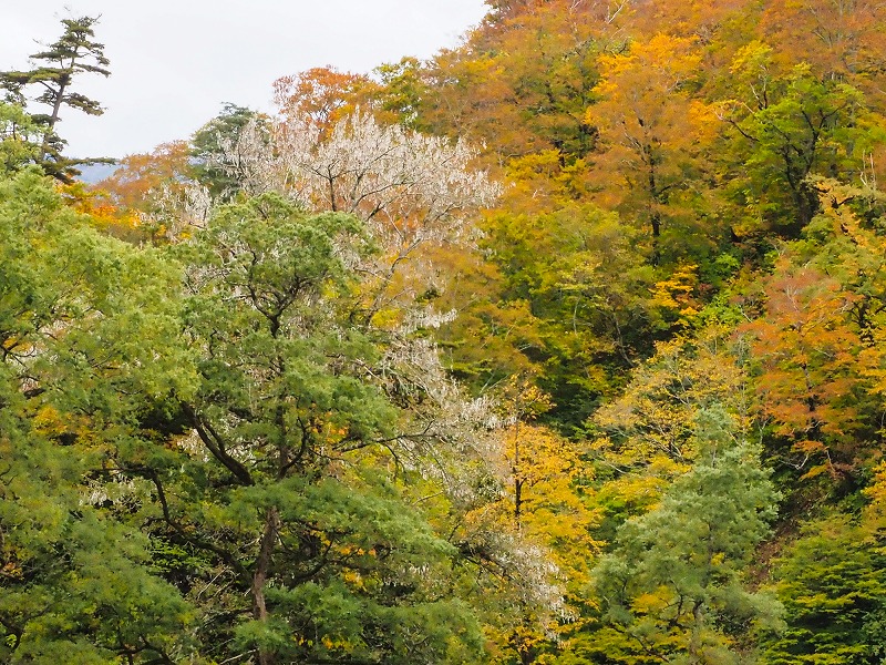 見上げるとオレンジに色づく樹のなかにひときわ目立つ真っ白な樹がある。