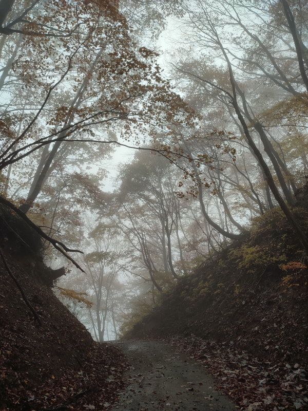 霧にけぶるブナの林の中の伊勢峠は幻想的でした。道路が出来る前のお地蔵さまが祀られた峠の風景を感じました。前に伊勢峠を訪れたのは何十年前だったか・・・・