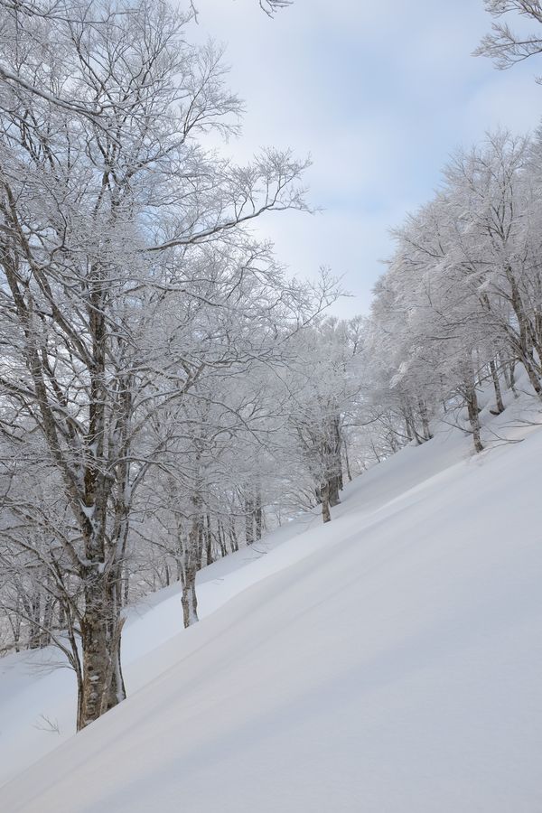 そしてそこから先は、新雪とブナ林とピーカンの青い空。この天気のおかげでやばいです。ほんとにヤバイかもです。