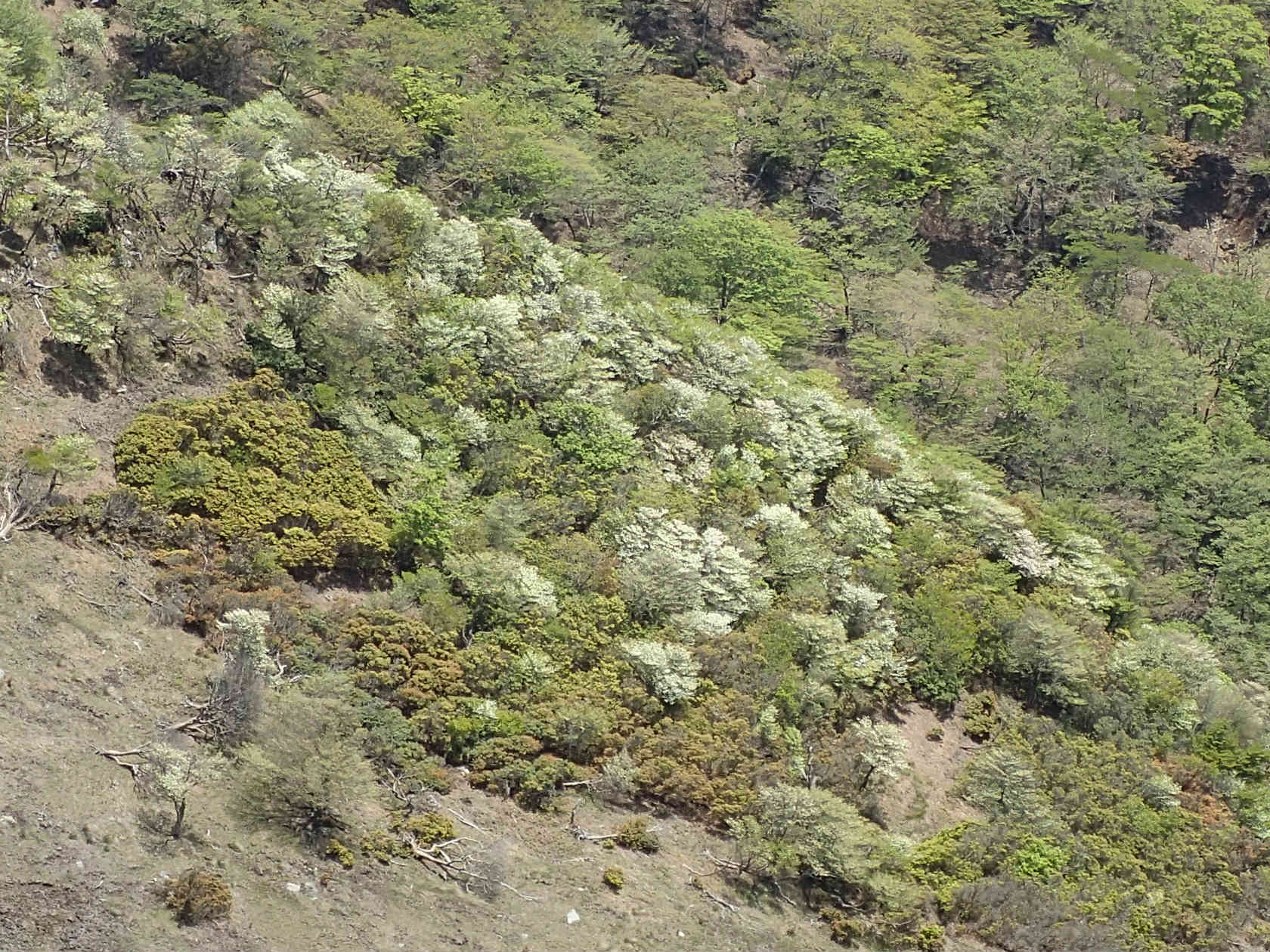 標高800mを越えるとシロヤシオも姿をあらわす。やはり今年の花付きはいいようだ。こりゃ20日が楽しみだ。車が停められるだろうか?(台高です)