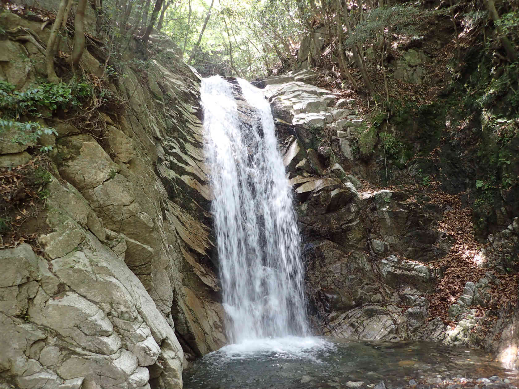 40分ほどで沢に出る。横谷と言うらしい。沢沿いに更に下っていく。堰堤が何箇所もあり,そのうちの一つには長い垂直の鉄梯子がかかっている。砂山分岐を過ぎ,しばらく行くと登山道が蛇谷を横切る。蛇谷にかかる五階滝だ。この滝を何回登っただろうか。昔はなんの気もなくフリーで登った滝だが,普通の登山者の目で見るととても怖くて登れないように見える。 五階滝を過ぎ,金山尾根道と合流してしばらく行ったところで,突然靴のソールが剥がれた。