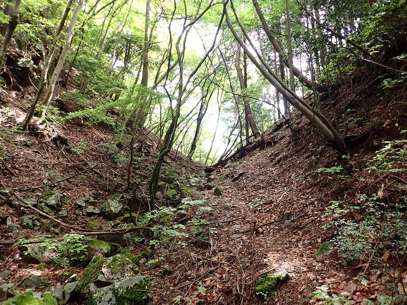 峠道に入ると5mを越える石垣が出迎えてくれる。この先にも同じような石垣が無数に出来るがほとんど崩れていない。台高山脈の多くの木馬道を見てきたが、使用時期が限定されている木馬道よりしっかりと作られているようだ。岩場を削った場所もありこう配の少ない道が続いている。大八車が通れる車幅があり、昔は馬車で越えてきた道だったようだ。とはいえ、人があまり通らない古道だけに石垣で守られていない場所ではバリルートのようになっている場所もある。
