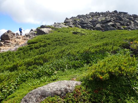 >山頂はトラバースして行くんでしたっけ。ハイマツ漕ぎはこの後いっぱい出てくると思うけど。